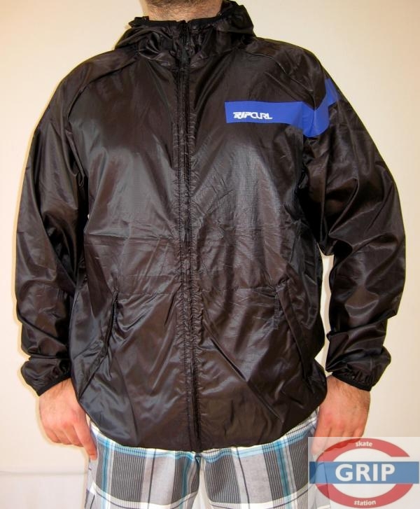 Jarní bunda Rip Curl. Na předním díle dvě kapsy kontrastní modrý pruh na něm bílé logo Rip Curl. Barva černá. Materiál 100% polyester bez podšívky. Rip Curl
